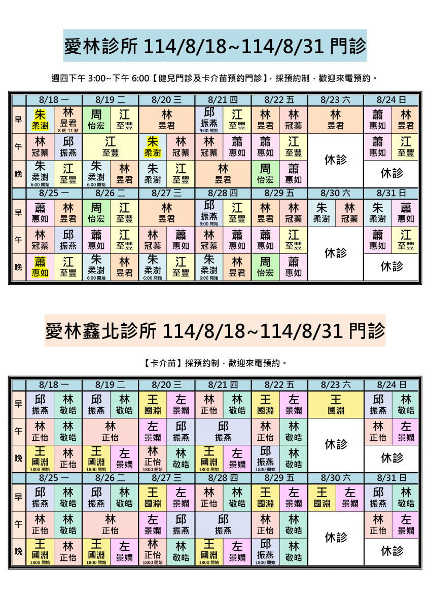 各位親愛的朋友您好:114/8/18-114/8/31兩院區醫師門診公告。