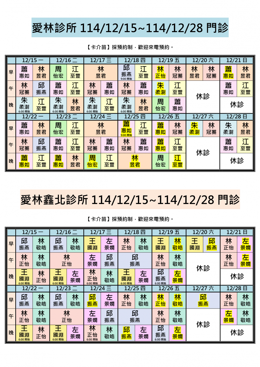 各位親愛的朋友您好:114/12/15-114/12/28兩院區醫師門診公告