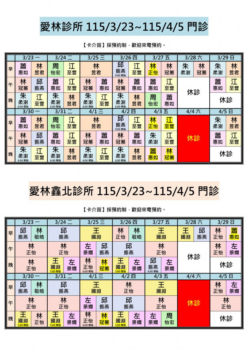 各位親愛的朋友您好:115/3/23-115/4/5兩院區醫師門診公告!