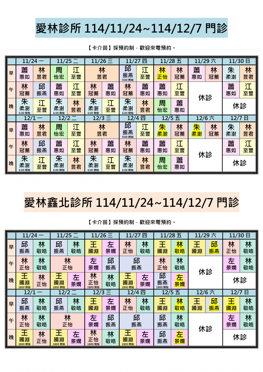 各位親愛的朋友您好:114/11/24-114/12/7兩院區醫師門診公告