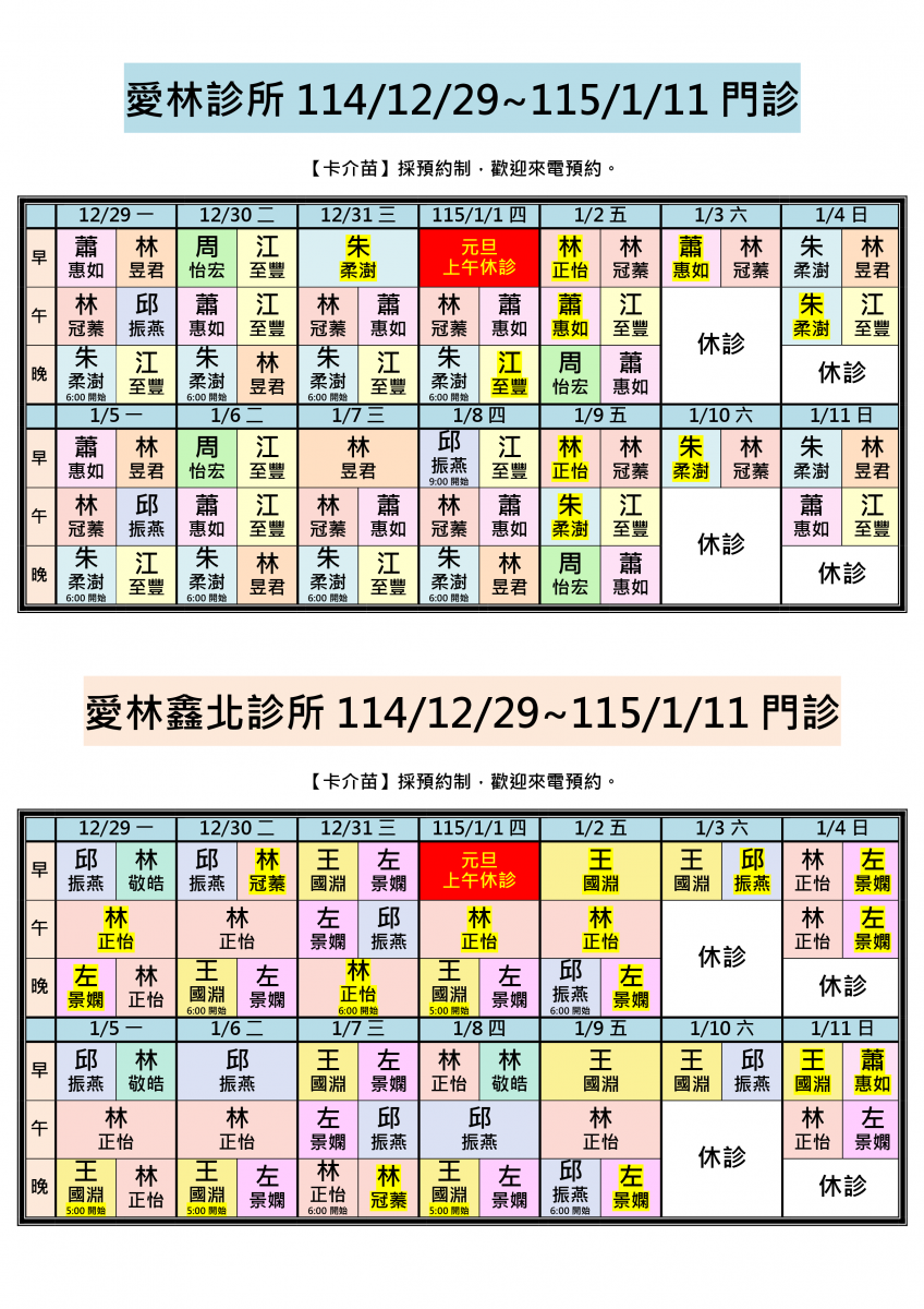 各位親愛的朋友您好:114/12/29-115/1/11兩院區醫師門診公告,115/1/1元旦上午休診,下午及晚上照常看診!