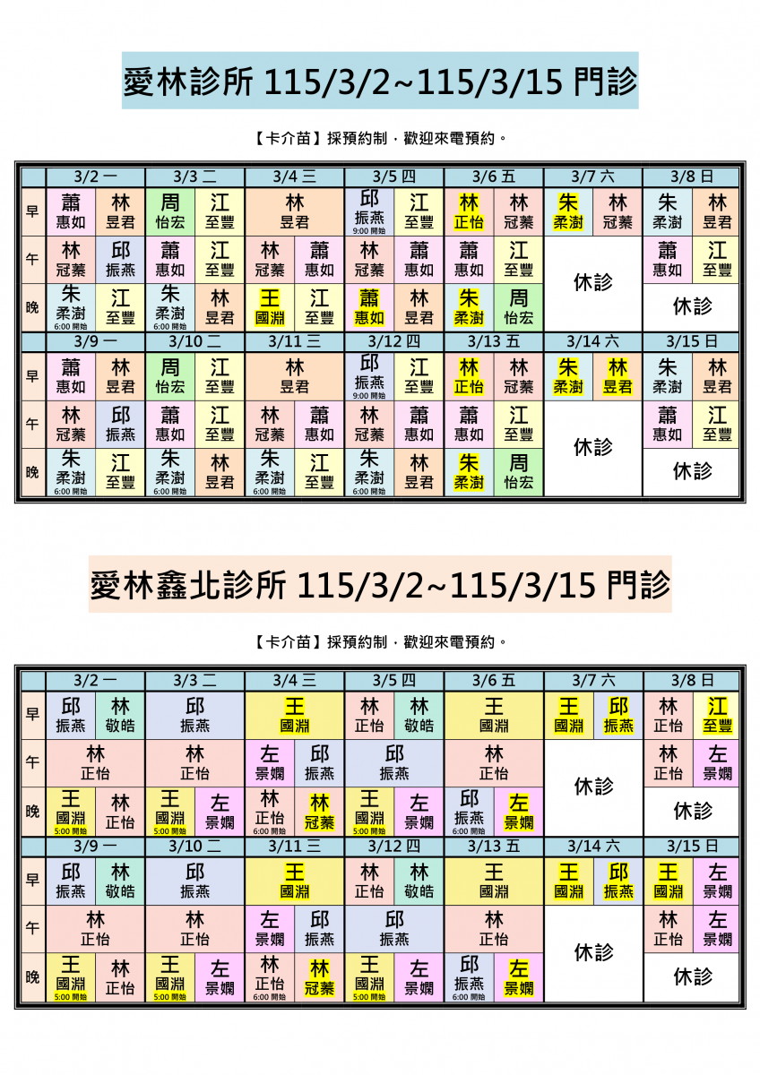 各位親愛的朋友您好:115/3/2-115/3/15兩院區醫師門診公告!