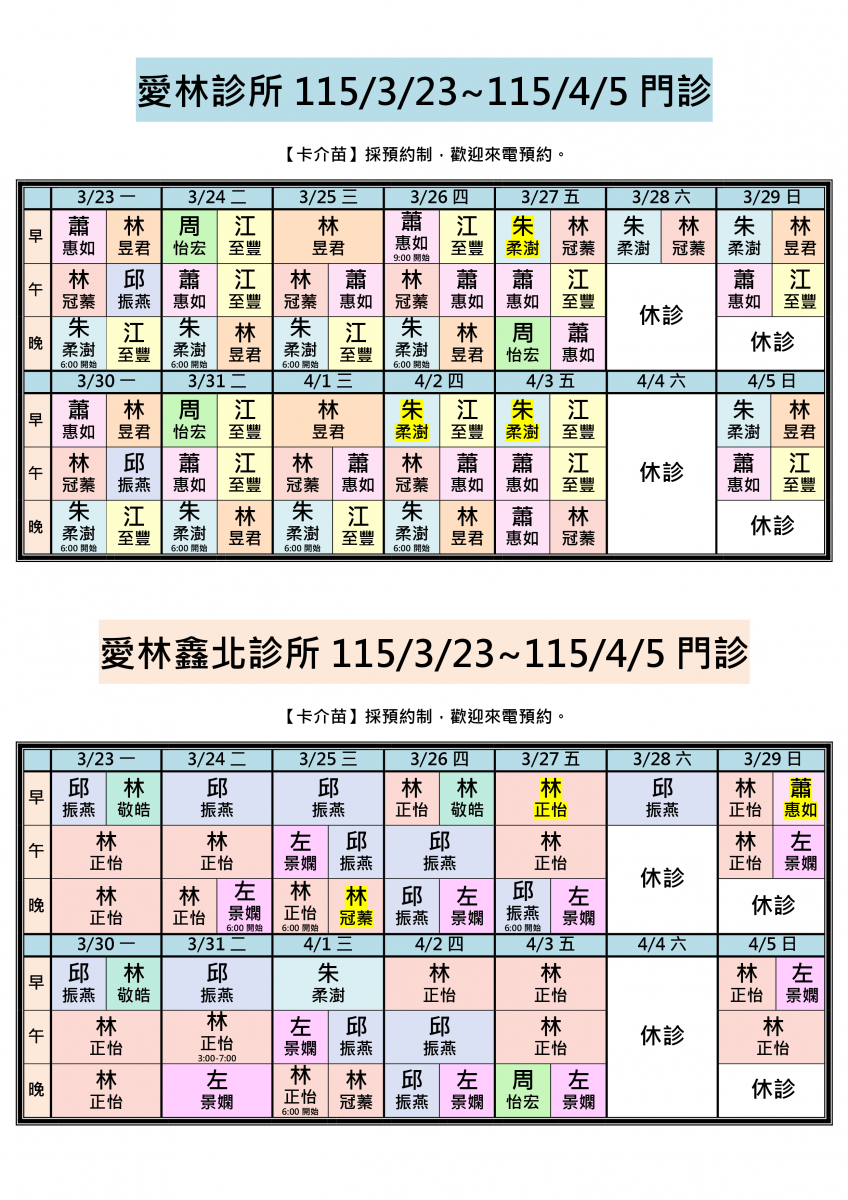 各位親愛的朋友您好:115/3/23-115/4/5兩院區醫師門診公告!