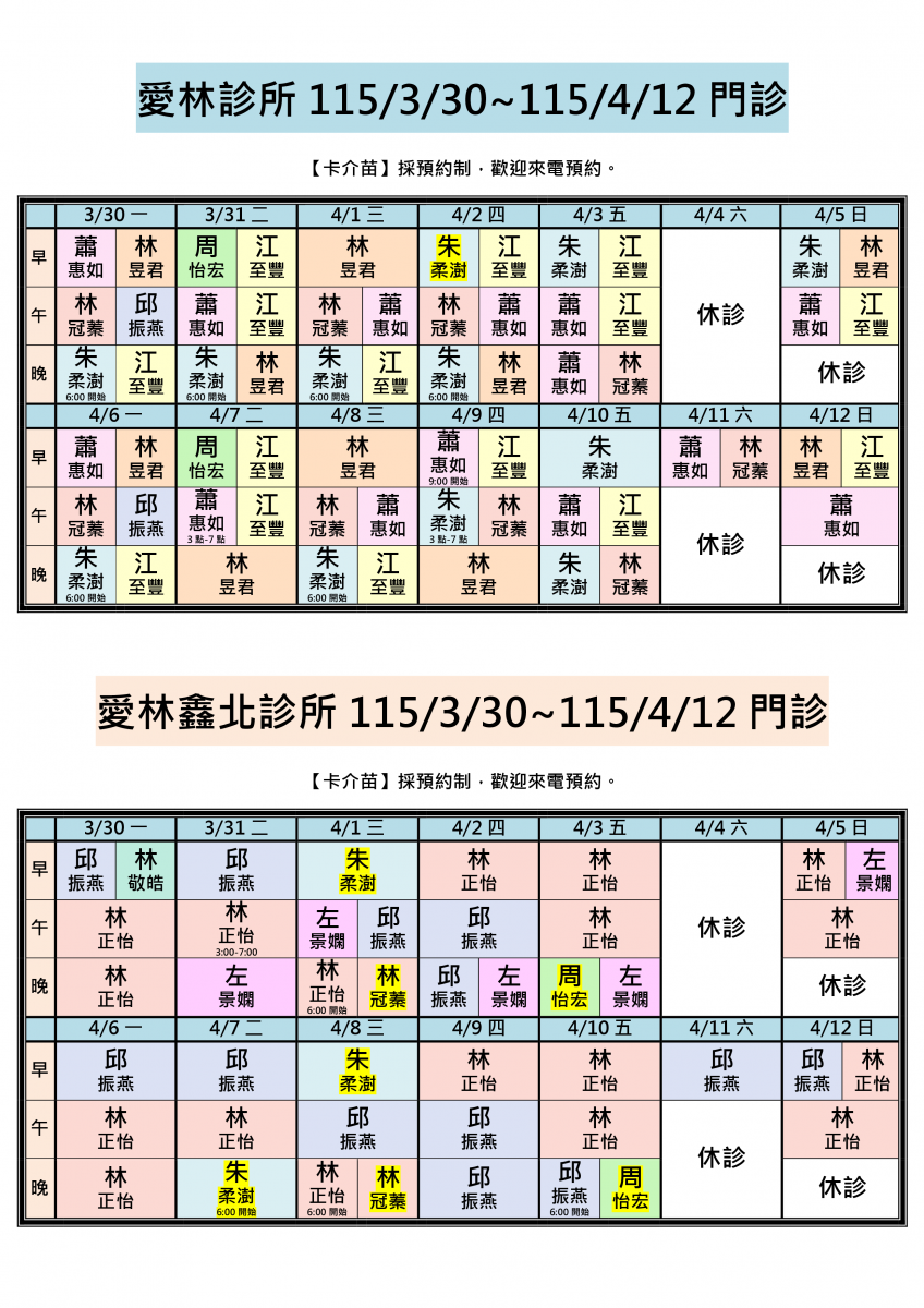 各位親愛的朋友您好:115/3/30-115/4/12兩院區醫師門診公告!