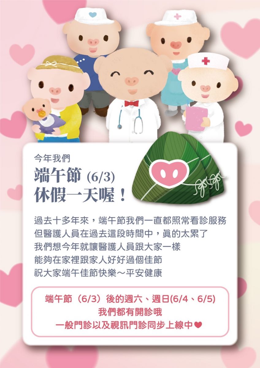 6/3(五)端午節全天休診,6/4(六)起恢復正常看診!