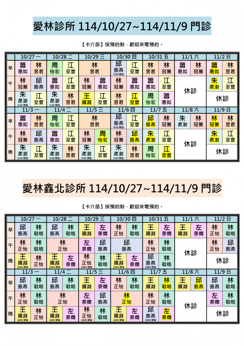 各位親愛的朋友您好:114/10/27-114/11/9兩院區醫師門診公告